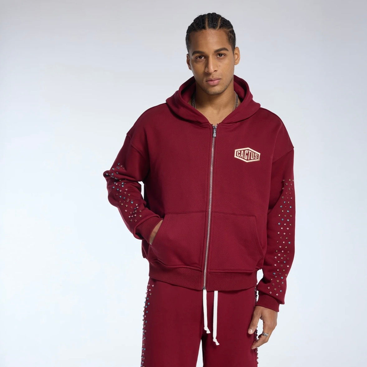 AZVA Maroon Crystal Cactus Zip Hoodie